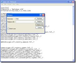 - Pilih menu Edit g Replace. Ketik Hide pada kolom Find, tetapi kosongkan kolom Replace With, klik Replace All. Tujuannya untuk menghapus semua kata Hide dalam file ini. Setelah selesai, tutup dan simpan file.